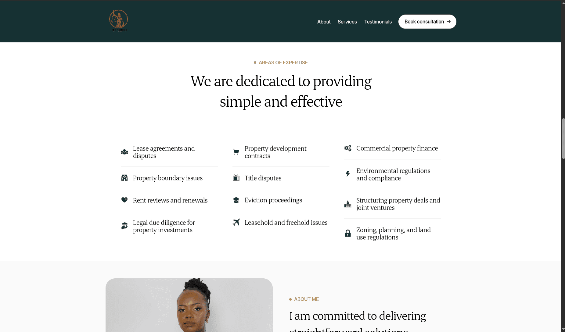 Property and real estate legal services are clearly presented, helping clients quickly understand the firm’s expertise.